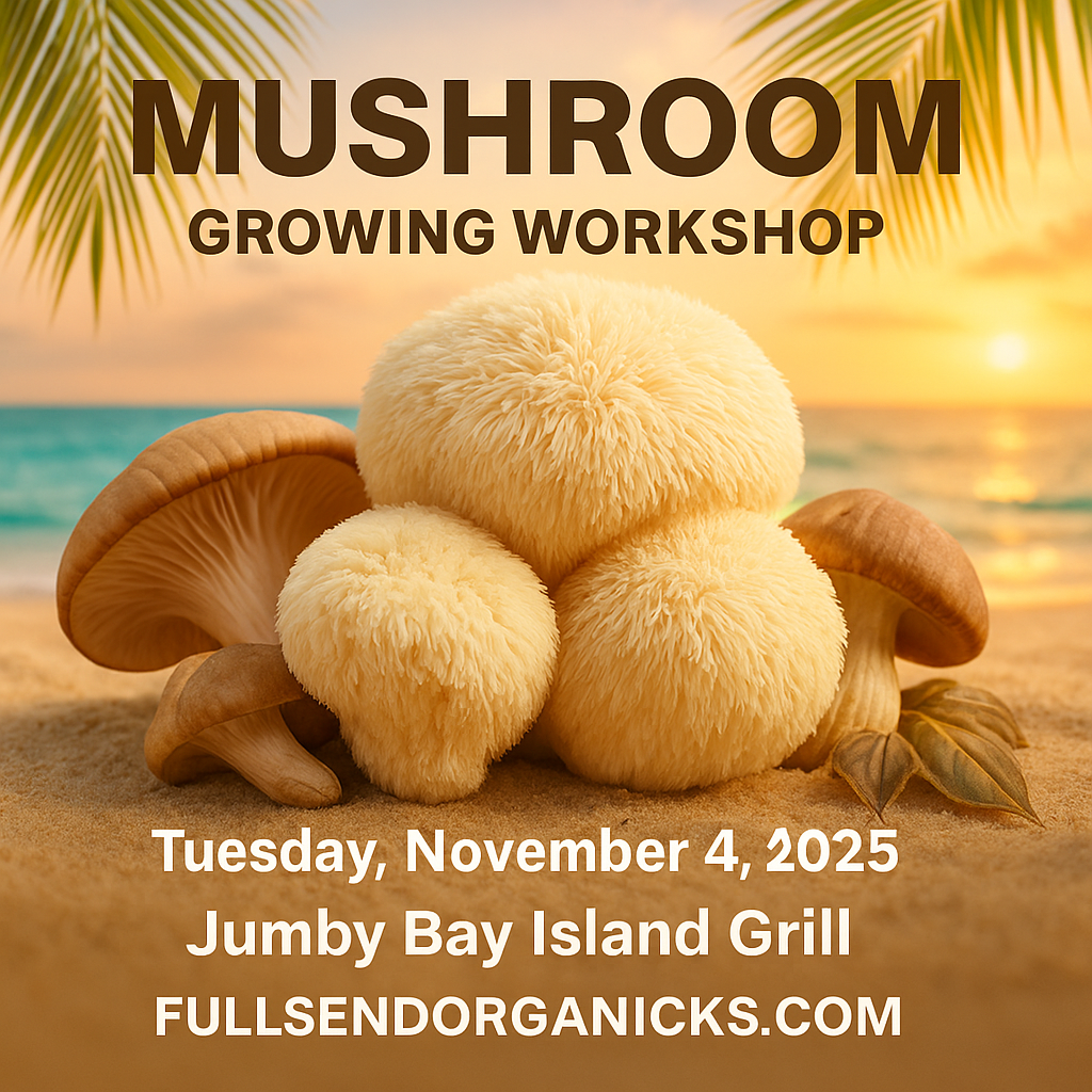 Join Fullsend Organicks for an unforgettable Mushroom Growing Workshop on Tuesday, November 4, 2025, at Jumby Bay Island Grill in Jupiter, Florida.